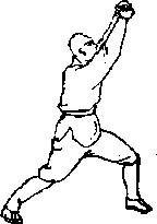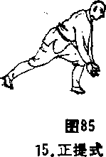 侧身斜立左腿屈右腿直两手指交叉用力上举过项目视前上方(图84)