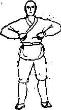 后绕至胸前握事屈肘作圈式两拳遥对相离一尺八九寸手背朝上,吞气一口右亦相同。左右各三次共吞气六口(图都)