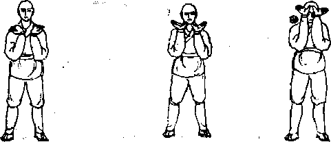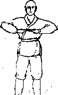 将手分开由耳后绕至胸前握拳两臂屈肘如抱物状两拳相距一尺八九寸正面吞气一口如此重复三次共春气三口(图89)心