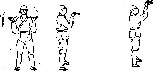 仰托过眉两小指相并顺势从额上抓下握拳仍与额藕平复舒拳又如初势仰掌小指相并仰托过额(图97)。