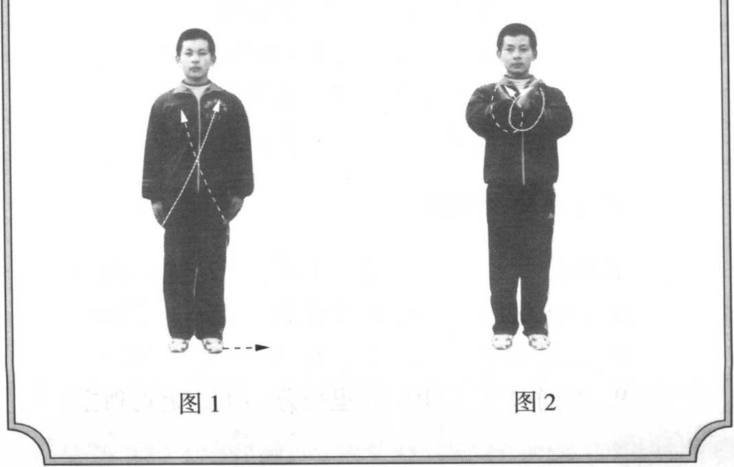 抬左脚向左半步。同时两手由下由外、向上、 向内屈肘交叉亮掌,高与肩平,右手在外,左手在 内。目视前方(图2)。