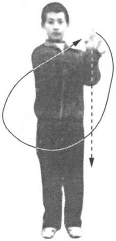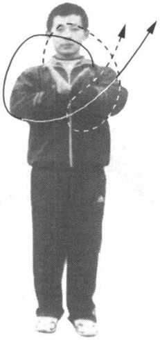 两手向上、向外、向下、向内、向右翻腕,同 时向脸部划弧,然后向左屈肘成上插手,高与肩 平。目视前方(图4)。