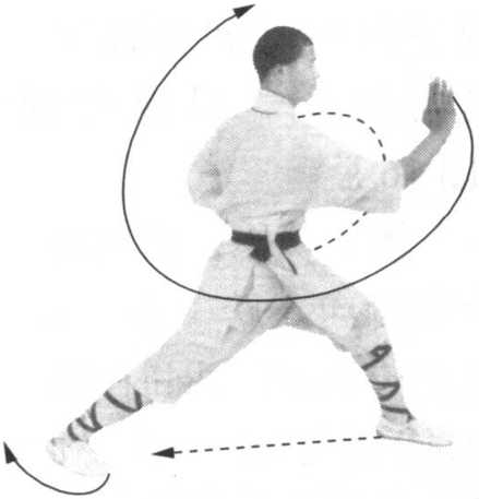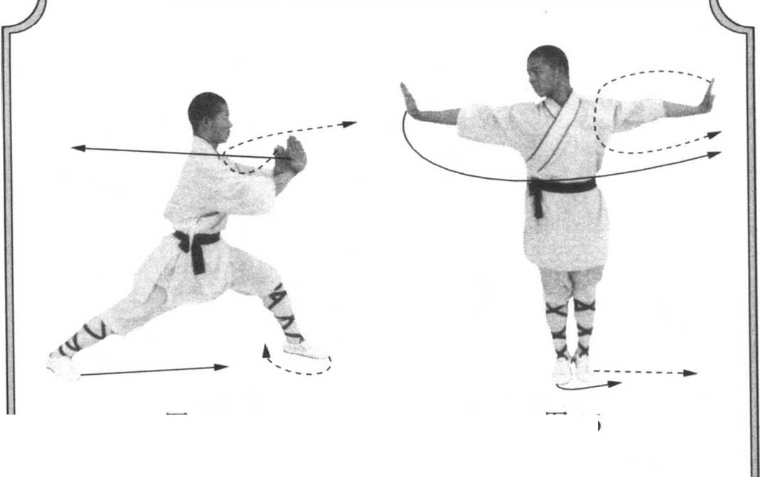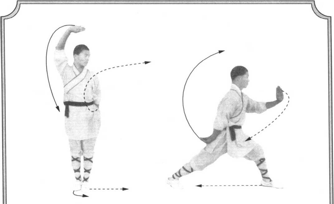 接上动作。抬右脚向前上一步,落于左脚后, 以两脚为轴,体向右转90度,使两脚并立。同时