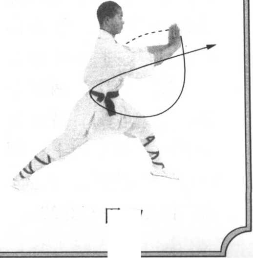 接上动作,两脚不 动。左掌收回,变拳端 于腰间,
