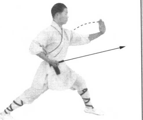 步。同时两拳变掌,向前屈肘推出,掌心向前。目 视两手(图15 )。