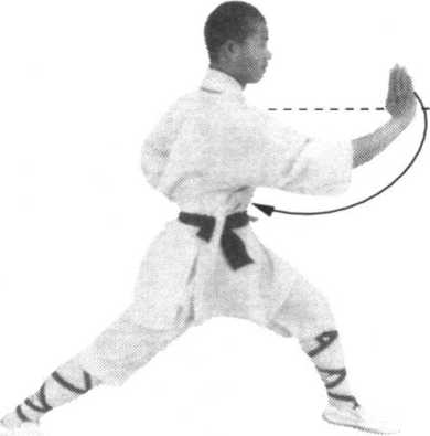 两脚不动,两掌由前向后收于腰间,右掌向前推 出,掌心向左;左手端于腰间。目视右手(图18)。