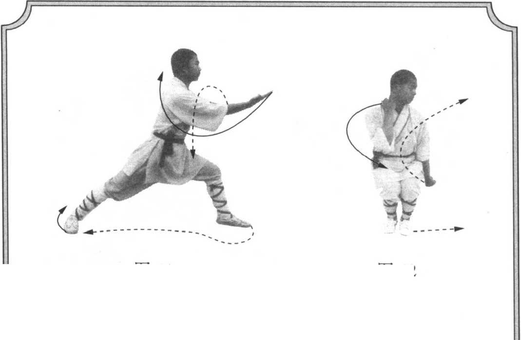 以两脚为轴,体向左转90度,右腿后蹬,成 左弓步。同时右拳变掌,向左膝上方插出,掌心 向上;左拳变掌,收于右肘侧,掌心向下。目视