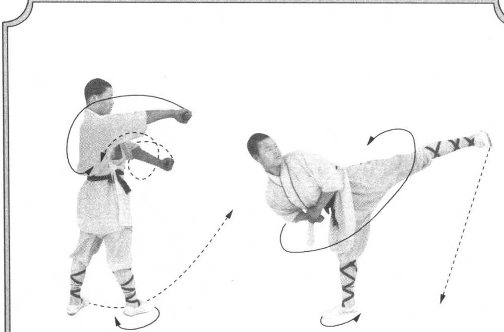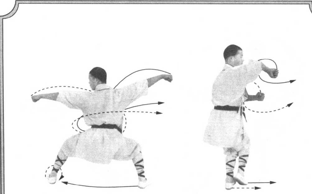 接上动作,抬右脚向右上一步,左脚紧跟着向 I前滑半步,同时两拳向前上下拦击,右拳在上,高 I与肩平;左拳在下,高与脐平,两拳心都向右。目