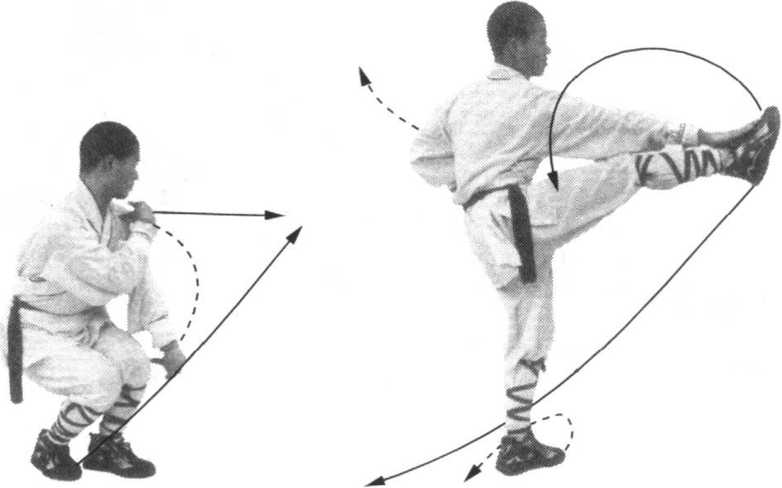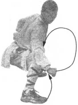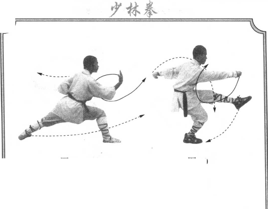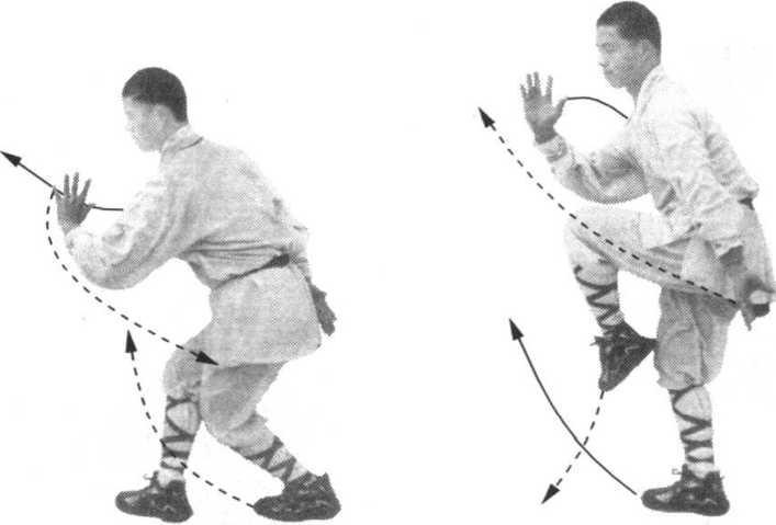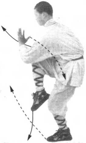 I 左脚下落右脚前,两腿屈膝微蹲。同时右爪由I]