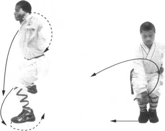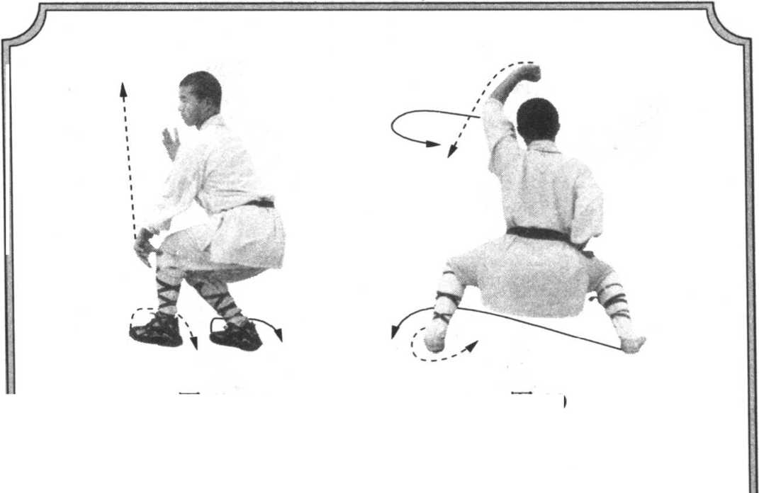两脚不动,体向左转90度,两腿屈膝半蹲,