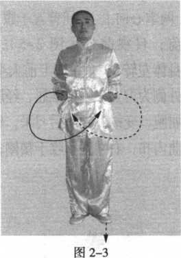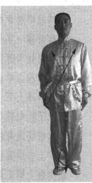身体正直。两脚跟并 拢靠齐,两脚尖分开约 45°,两腿挺直站立;两臂 自然下垂,两掌轻贴于身 体两侧,挺胸收腹;目视 前方。(图2-1)
