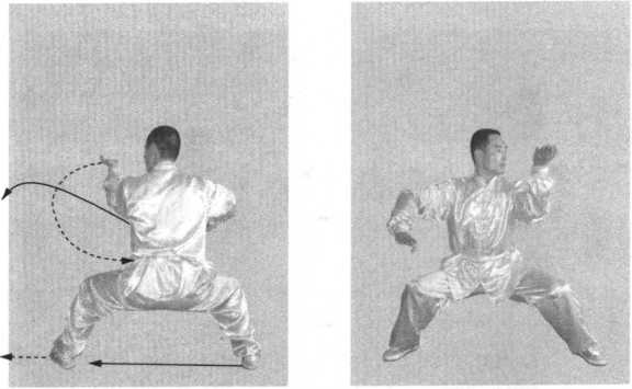 两腿屈膝半蹲成马步;同 时,左掌翻转屈肘上托, 掌心向上,高与肩平,右