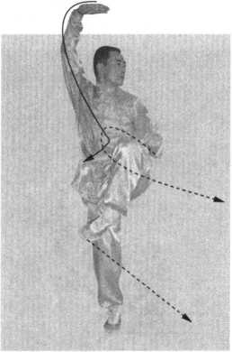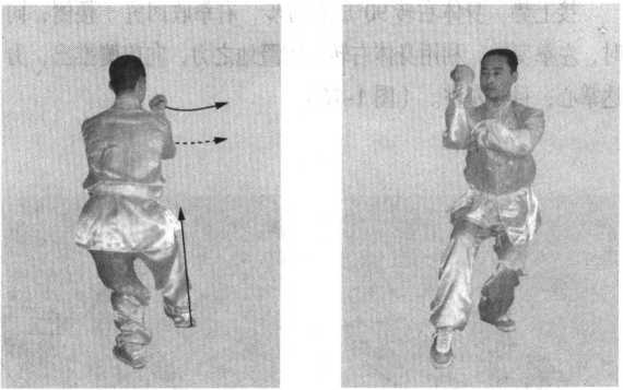 接上势。右腿屈膝上提,身体右转,右拳变掌,由左经体 前向右后挡击,两手臂微屈;目视前方(图1-18 )0右脚下落