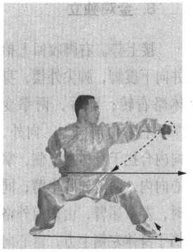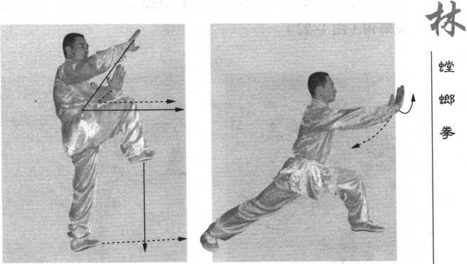 震脚,左脚上前一步成左弓步;随后,两掌下落向前推出,高 与肩平,两手臂微屈;目视前方。(图1-19) 高于裆部(图1-21 )0随后,左掌从右臂下侧向前划动变螳 螂钩,向前摔击,力达钩背及钩指,高与面平;同时,右掌 抽回变拳收于腰侧,右腿迅速回收成提膝护裆姿势;目视左 螳螂钩(图1-22)