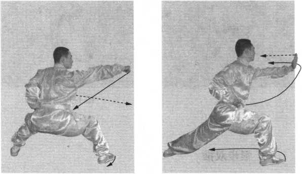 接上势。身体右转90。成右弓步,右拳收回置于腰侧;同 时,左拳变掌,利用身体右转左脚蹬地之力,向前侧推出,力 达掌心;目视左掌。(图1-16)