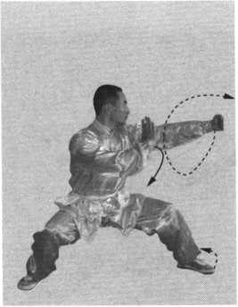接上势。右脚上前一步,身体左转90。,两腿屈膝半蹲成