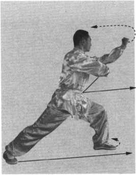 接上势。身体左转90。成左弓步;右掌向前屈臂下按,左 拳 拳屈臂回收,随之向前崩出,拳心斜向上,手臂微屈,高与鼻 平,力达拳背;目视左拳。(图3-19)