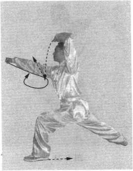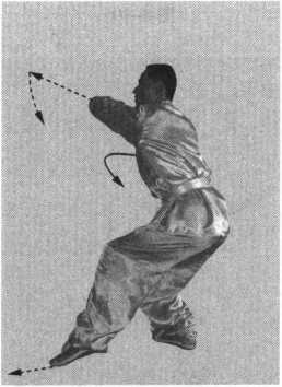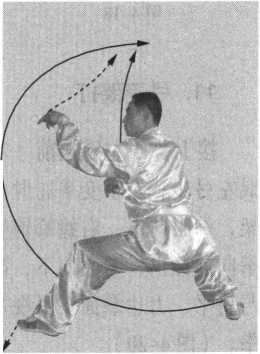 接上势。重心后移至右腿,左脚后撤成左虚步;同时,上 体后仰,两手变掌收于面前,左掌拍击并抓握右手腕,上体前 倾;右手在面前顺时针旋腕一圈刁缠变螳螂钩手;同时,左手 屈臂成肘,由外向内横扫,力达肘尖,高与肩平,身体右转; 目视左肘。(S 4-21)