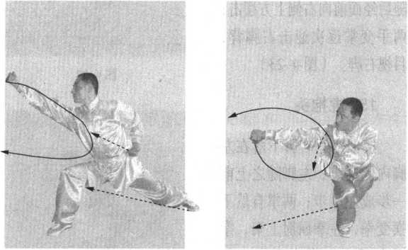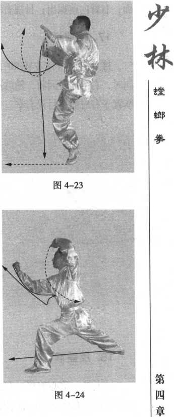 接上势。身体左转90。,右腿屈膝左脚扣于右腿胴窝处; 同时,右拳屈臂回收,随后翻转向前探击,拳眼向下,左拳变 掌置于右肩侧;目视右拳。(图4-26)