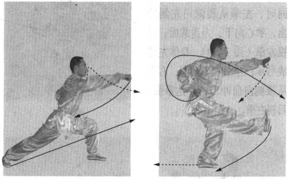 接上势。身体左转90。,右脚抬起下落至左脚内侧处震