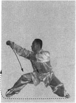 内侧地面,以左脚掌为轴,利 用身体的拧转惯性,右脚贴地 面向后扫出,力达小腿及脚 跟;目视右后方。(图4-68)