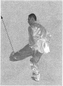 47.卷踢送腿47.卷踢送腿接上势。身体稍起,重 心移至右腿,左脚内扣,脚接上势。身体稍起,重 心移至右腿,左脚内扣,脚图 4-65图 4-65