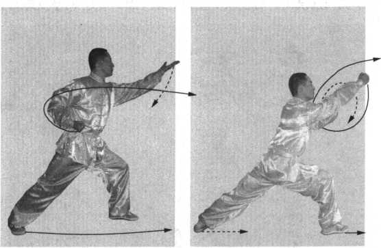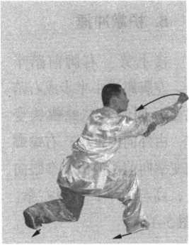 屈臂回收;身体重心后移,左 脚回收小半步成马步;两螳螂 钩随腰部摆动,逆时针微晃臂 三小圈;目视前方。(图5-7)