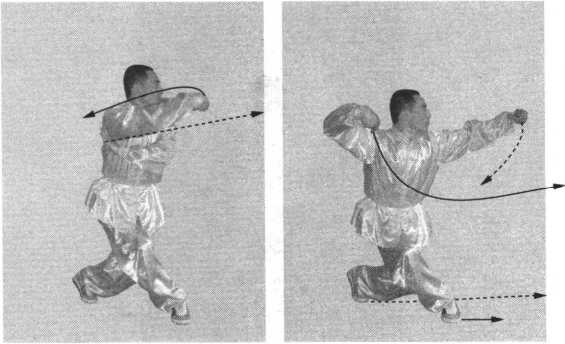 接上势。身体微起,左脚 前移;左螳螂钩变掌外展前伸; 右螳螂钩变拳摆于身体右侧; 目视左掌(图5-8 )0右脚上前 —步成右弓步,同时,右拳向 前上方劈出,拳眼向上,高与鼻平,力达拳轮;左掌迎击右前 臂;目视右拳。(图5-9)