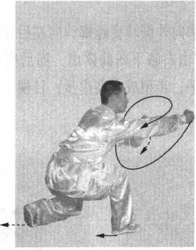 接上势。右脚上前半步, 左脚随之跟进小半步,成右 七星步;同时,右拳屈臂回 收于胸前;左掌由右肘前侧 下封于身体右侧;右拳抖腕 向前崩出,高与鼻平,拳心 斜向上,力达拳背;目视右 拳。(图 5-21)