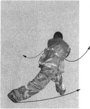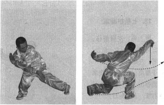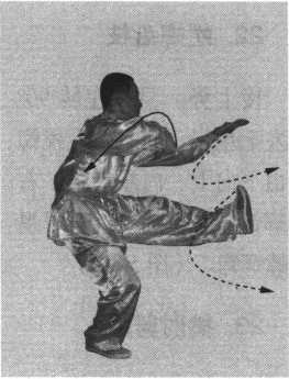 图 5-28图 5-28接上势。身体左转45。, 将' 右掌向外翻转,掌心向上, 严 随后由前向后削击;两腿屈 膝交叉;左臂置于右臂上侧 螂(图5-28、图5-28附图)。右 拳脚上前一步,左脚跟进小半 步成右七星步;同时,左掌 变螳螂钩向后勾挑;右掌变 螳螂钩向前挑击;目视左后 侧。(图 5-29)