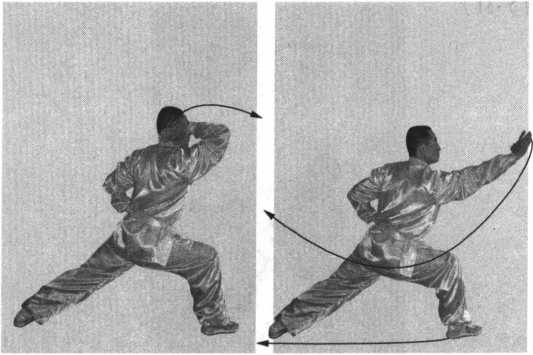 接上势。身体左转90。 符成左七星步;同时,左螳螂