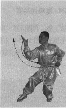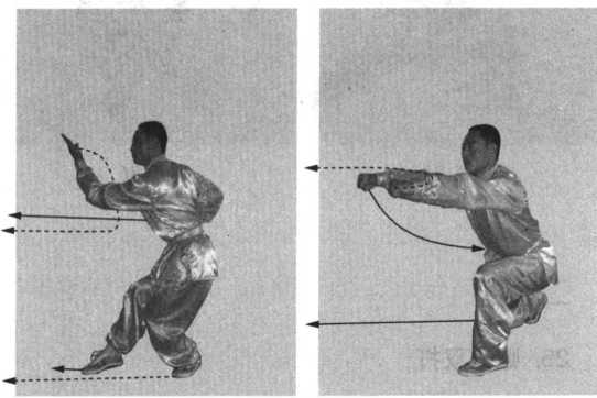 ??心斜向上,力达手臂内侧;右 祐掌变拳收于腰侧;目视左掌