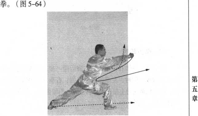 图 5-63图 5-63接上势。右脚上前一 步成右弓步;同叱右拳向前冲出,拳眼向上,高与肩平,力 达拳面;左掌收于右肩内侧,掌心向外,掌指向上;目视右