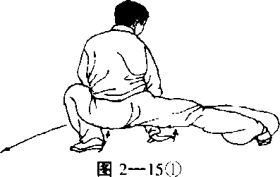 ① 身体下蹲,右腿伸直成右仆步;两掌按于裆前, 两指尖斜向右前;目视仆步方向。(图2-15①)