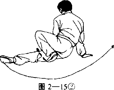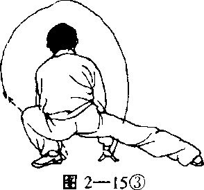 ③ 上动不停,右腿继续向后扫转;左脚蹬地离地, 而后落地,使右腿经左腿下向后、向右扫转成右仆步; 目视仆腿方向(图2-15③)