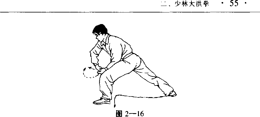 上动不停,身体上起,左腿屈膝前弓成左弓步;同 时右拳向上、向左,经头前上方(身体左拧)向前下方 捣臼,拳心向内,在左膝内侧击于左掌心内;目视右 拳,同时以气催力,借势大喝一声。(图2—16)