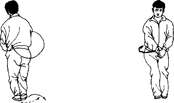 右腿向右跨一步,左脚跟步靠在右脚内侧,脚尖点 地,两腿屈膝半蹲成左丁步;同时右拳向右、向后、向 左挥于体后,拳心向后;左掌变拳向右至于腹右侧,拳 心向内;眼向左看。(图2 —18)