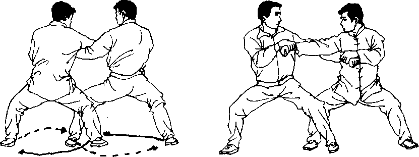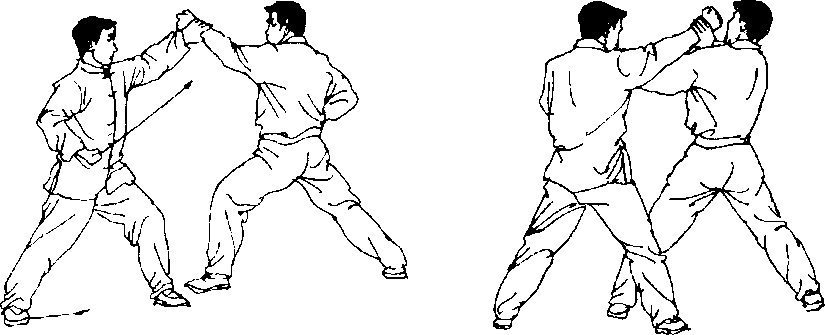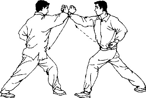 ①甲、乙右脚撞击左脚跟,左脚离地后落前方成左 弓步;右臂内旋,右掌变拳由下向上碰击对方小臂外 侧;左手抱拳于腰侧,目视对方。