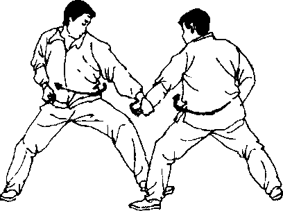 与乙有一臂之间距;左拳抱于腰侧,目视对方。