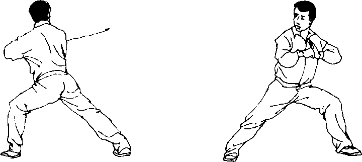 ① 身体左转成左弓步,右手变拳屈肘,拳心向下, 收至胸前;左手变掌按在右拳之上;眼看左手。(图2一 9①)