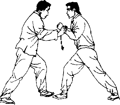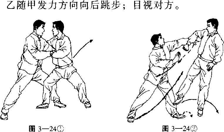 甲抓乙双腕屈臂至胸前,顺势推至两体之间;目视 对方。