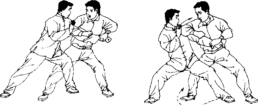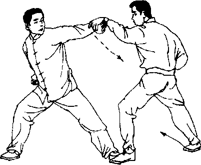 乙顺势含胸,双臂由内向外划弧;目视对方。