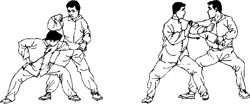 甲右手抓乙右肘关节,上体靠乙;目视对方。