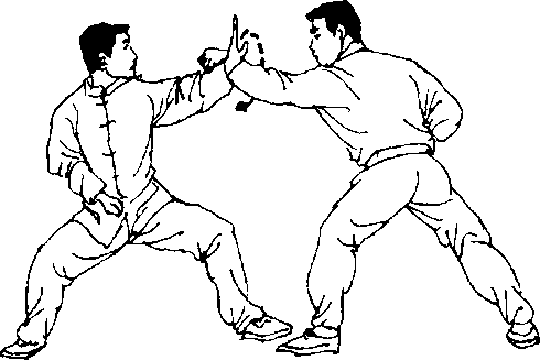 甲上右步成右弓步;右拳变八字掌,右臂由屈到伸 向前推击乙腰侧;目视对方。