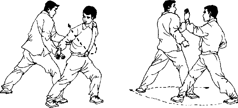 ① 甲、乙双手离开,上体右转上左步,退右步,同 时伸左手;目视对方。
