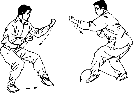 乙上体右转成右弓步,左臂内旋;右手抱拳于腰 侧,目视对方。