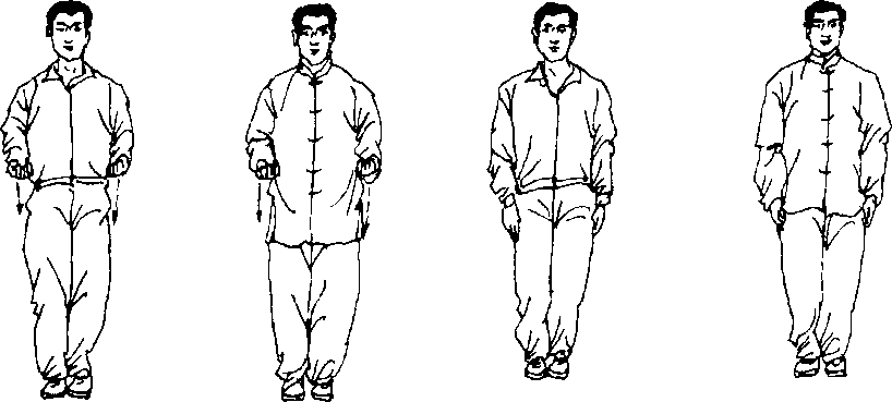 乙上左步并右步,双拳抱于腰侧;目视前方。