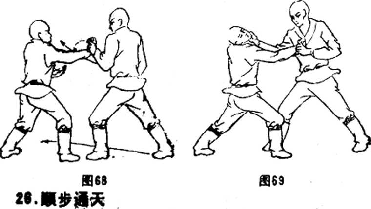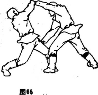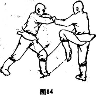①乙左脚上步,用右直拳向甲打去,被甲左手抓住(图 64 >。②甲左手抓着乙右手向乙腧部推压,左脚上步,同时,