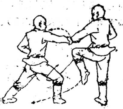 于乙的右臂被压在其脸上,其身出现了拧劲,而其左手是难以 还*的。在实际运用当中,往往是当我的右亍被对方右手接 住时,我吸胸坐步,转环搂缠脱开,反抓其手,递于左手向 对方脸上推压,右手抽出去搂扒对方左腿腿弯。