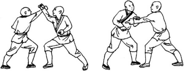 他冲右拳猛飞来,我出右拳挡一侧。